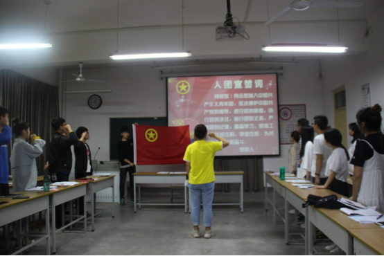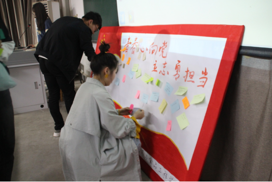 活动在《青春与祖国》视频中拉开序幕。接着,团总支副书记潘碧香向大家讲了关于共青团的一些常识,让团员们对共青团有了更深刻的了解。在观看习近平总书记在纪念五四运动100周年大会上的讲话视频,同学们结合自身实际和习近平总书记的教育思想分别谈了感想。期间,员工会主席张森森、徐艳清表示将继续深入贯彻学习习近平总书记的教育思想,将思想和行动统一到现实生活和学习中,努力成为德、智、体、美全面发展的社会主义建设者和接班人。最后,全体起立歌唱《共青团团歌》,团总支副书记潘碧香带领团员宣读入团誓词。活动结束后,大家相继在心语墙上献上自己的青春寄语。