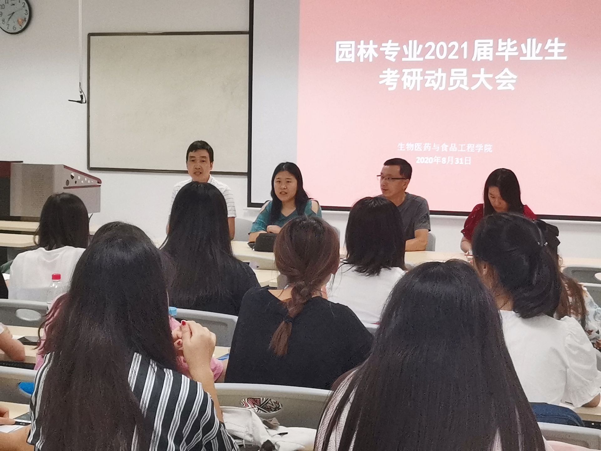 本次动员会分专业、错时交叉进行,分别由生物技术、食品科学与工程、制药工程、园林四个本科专业系主任主持,党总支书记丁争尚教授、副经理赵永平副教授、辅导员魏信平副教授、各专业青年教师代表参加此次考研动员会。