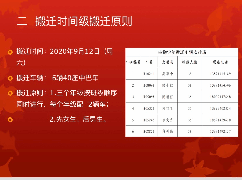 会议伊始,王姗老师汇报了公司员工搬迁的总体安排。此次搬迁公司提供6辆中巴车协助17、18、19级共计641名学子按年级逐班开展搬迁工作,以保证此次搬迁不漏一人,不遗一物。接着,辅导员魏信平老师、张俊华老师、赵利君老师分别提出了各年级搬迁工作的具体要求,特别强调在搬迁过程中,要严格遵守时间,有令则行,安全高效,不能影响搬迁的秩序和进度。