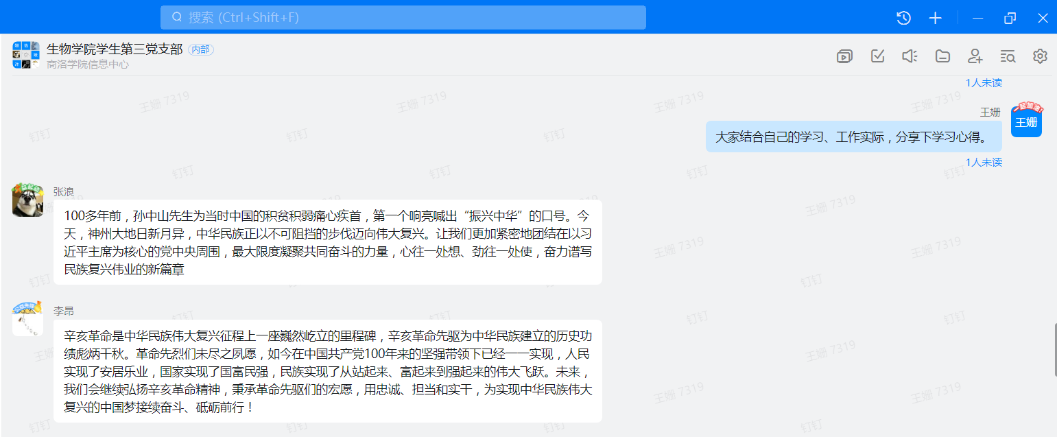 各党支部集中观看习近平总书记在纪念辛亥革命110周年大会上重要讲话后,根据各支部情况开展了分享心得体会、凝聚前行力量等交流活动。教师党员共同缅怀辛亥革命的仁人志士,共同探讨辛亥革命的精神和时代意义,纷纷表达了要牢记使命、勇于担当,在自己的教学和科研领域脚踏实地、有所建树。员工党员代表在线分享了个人学习体会,纷纷表示生活在和平年代的我们,更要珍惜今天的幸福生活,要加强自身学习和能力提升,强化作为党员的责任担当和时代使命,为推动中华民族伟业贡献青春力量。