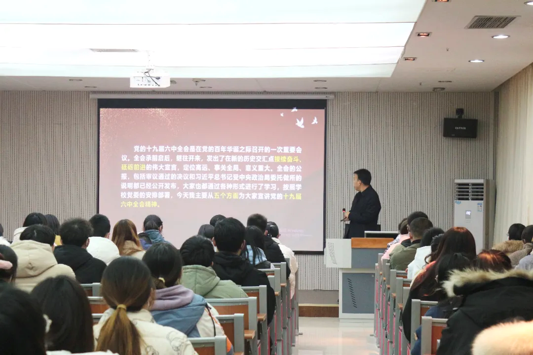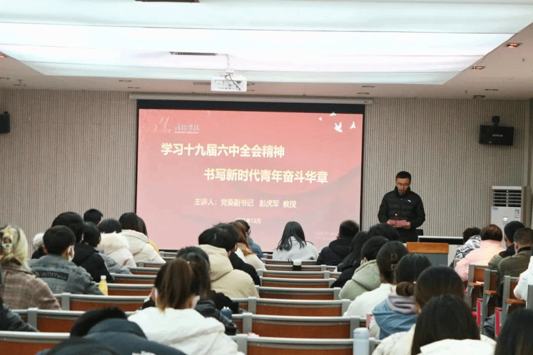 为引导广大师生深刻领会十九届六中全会精神的丰富内涵和思想精髓,营造学习全会精神的浓厚氛围,12月8日,党委副书记彭虎军以党委党史学习教育宣讲团成员的身份深入公司,在丹江校区报告厅为公司师生宣讲党的十九届六中全会精神。公司党总支副书记赵永平主持宣讲会,公司各党支部委员会成员、全体辅导员、员工党员、员工代表90余人聆听宣讲。