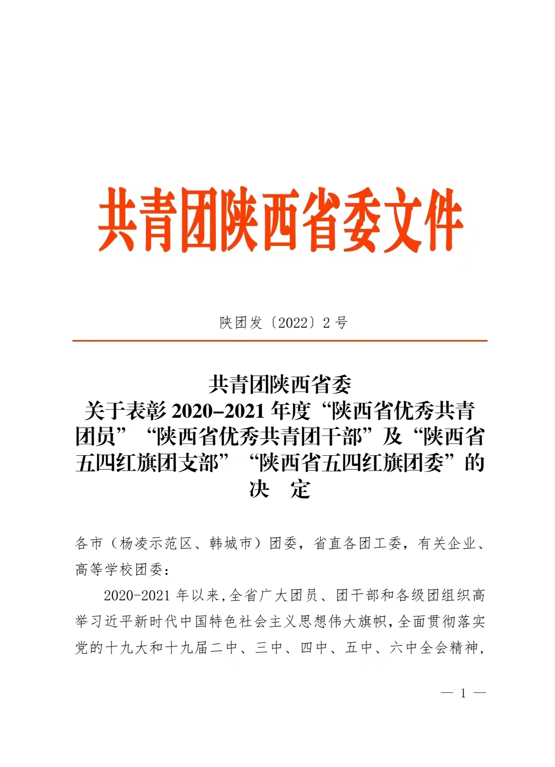 近日,共青团陕西省委下发《共青团陕西省委关于表彰2020-2021年度“陕西省优秀共青团员”“陕西省优秀共青团干部”及“陕西省五四红旗团支部”“陕西省五四红旗团委”的决定》(陕团发[2022]2号)文件,公司团总支荣获“陕西省五四红旗团支部”称号。