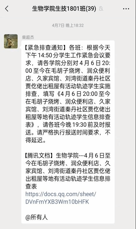 接到摸排通知后,公司全体学工人员、班主任教师迅速响应,一一对应30个班级952名员工进行框定时间点和地点的细致摸排,将摸排时间精确到分秒,确保“不漏一人、不漏一分”。初筛上报公司研判后,公司没有师生与病例有时空交集,无员工因为疫情被隔离。