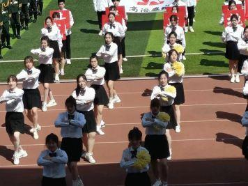 乐曲的韵律似欢快的呼唤,装扮着青春的倩影,轻盈的舞姿托起欢腾无限,翩若惊鸿、矫若游龙,绿茵场霎时变成了炫彩多姿的舞台。