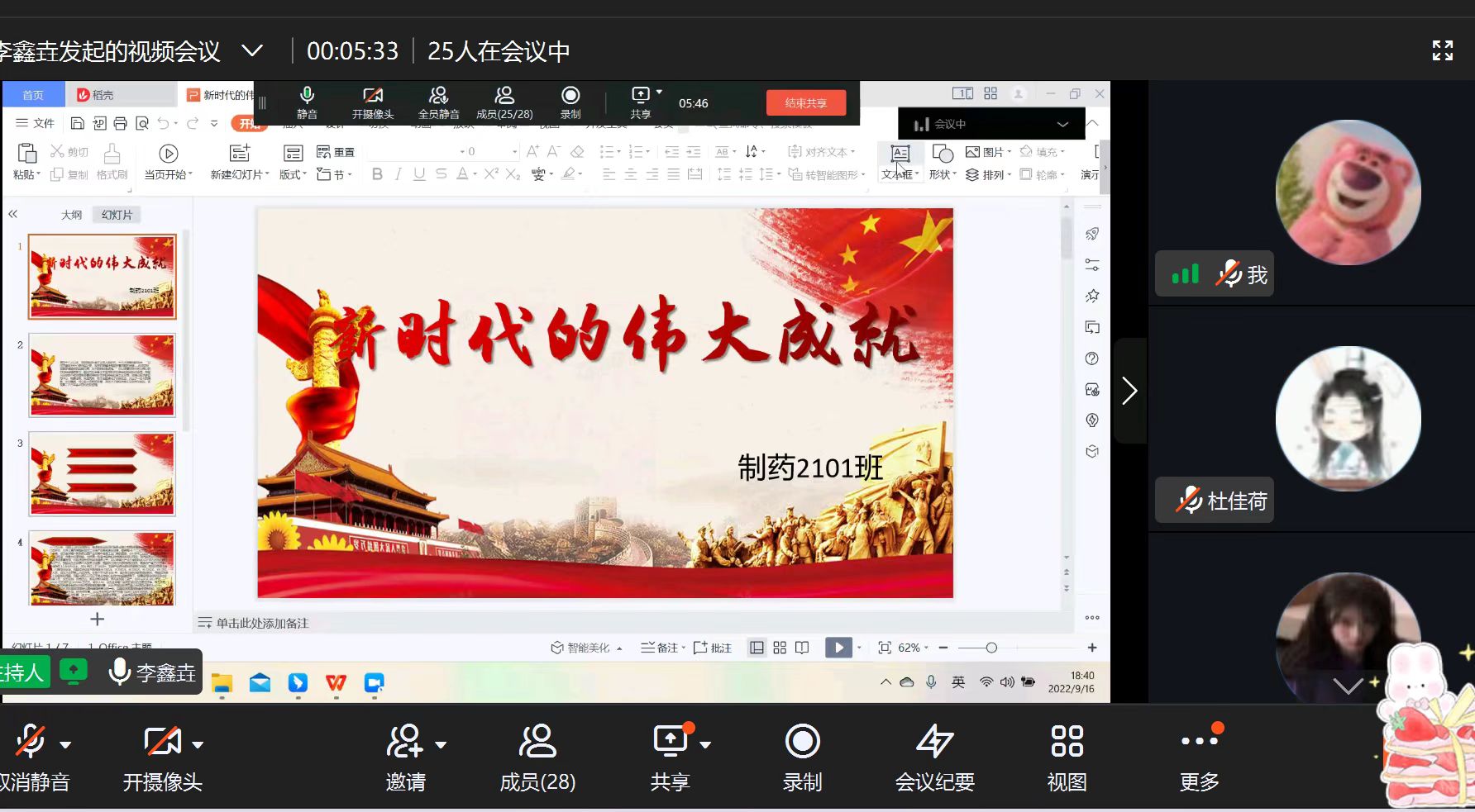 青年是祖国的未来、民族的希望,也是党的未来和希望。各团支部采用线上开展学习“新时代伟大成就”主题云团日活动,学习了《论党的青年工作》一书,支部团员全面回顾了九年来党和国家对青年的殷切期望和嘱托。