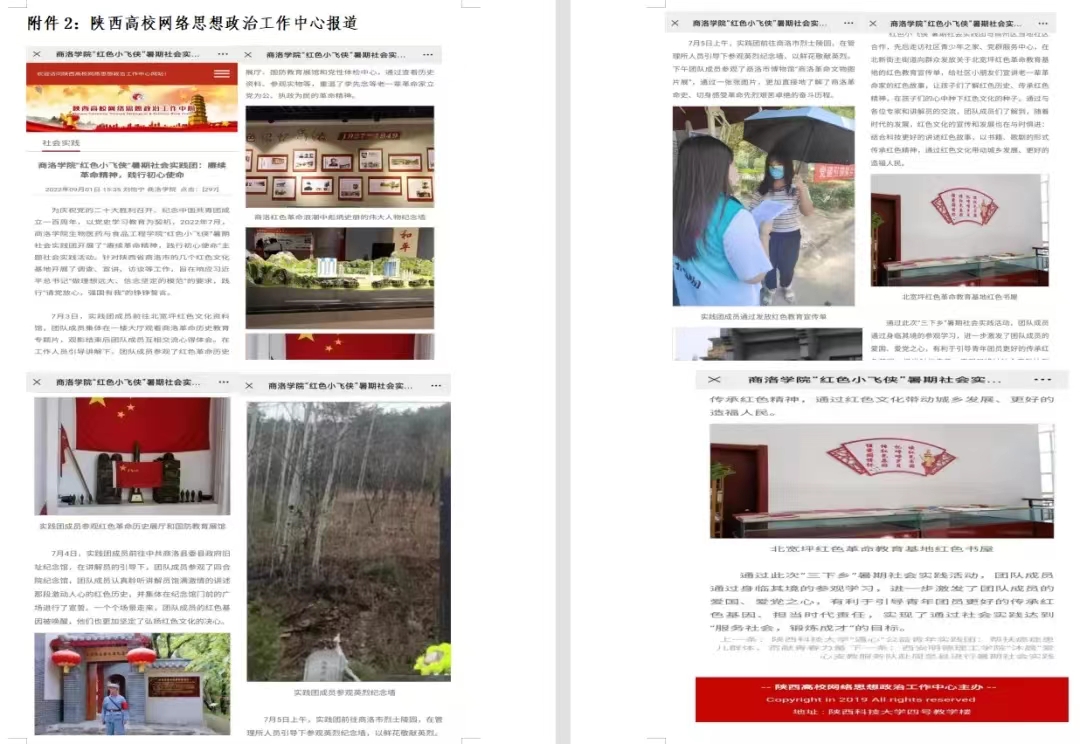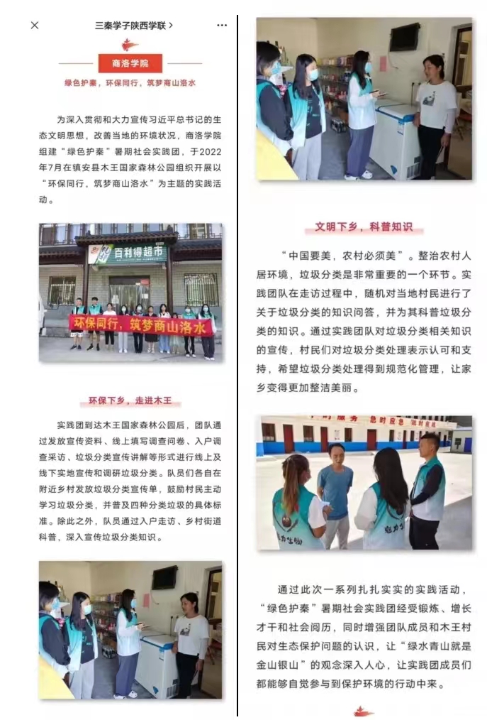 2022 年暑期365英国上市官方网站团总支在疫情防控常态化背景下,结合中省文件和校团委关于开展社会实践的通知要求,采用线上线下相结合的形式积极开展社会实践活动,共计组建10支社会实践服务团队的80余名同学奔赴省内各地开展党史学习实践、乡村振兴促进、发展成就观察、“情暖童心”实践、生态环保等社会实践活动。实践团师生共走访30余处,发放宣传资料600多份,发放调查问卷1000份,回收各团队80余份心得体会,全院累计“三下乡”时长3600余小时。公司团队开展社会实践活动受到当地人民群众的热烈欢迎和高度赞誉,受到陕西高校网络思想政治工作中心、三秦学子陕西学联、今日头条、搜狐网、365英国上市公司官网、365英国上市公司团委微信公众号、多彩老员工微信公众号、三秦学联微博等主流媒体报道25次,活动成果获得广泛关注。