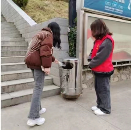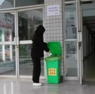 在活动期间,志愿者们在校园内垃圾桶旁分别散开,引导同学们正确分类垃圾,并向同学们积极宣传垃圾分类的意义。