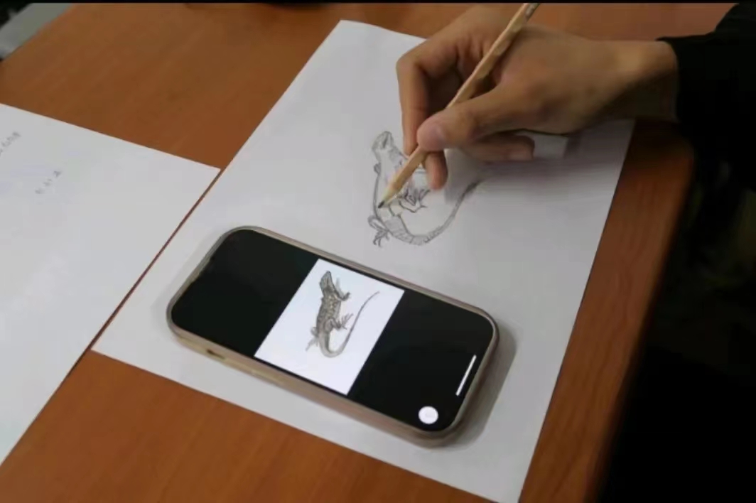 之后,自然笔记绘制教师为同学们讲解了蜥蜴的绘制要点,同学们自行绘制自然笔记。跟随小编一起看看他们认真绘制笔记的模样吧!