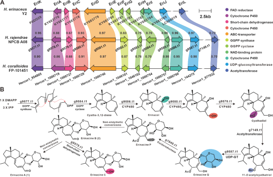 团队使用Illumina NovaSeq和Nanopore Prometh ION技术对拉式猴头菌进行全基因组测序,并实现了近染色体水平的组装。比较基因组分析揭示了拉氏猴头菌与猴头菇、珊瑚猴头菌基因组之间相似性和差异性。系统发育基分析、转座子分析、基因家族变异等研究方法揭示了拉式猴头菌的分化时间、进化特征和基因家族变异。并借助生物信息学手段,对拉氏猴头菌交配系统、碳水化合物代谢相关酶进行了预测。此外,还对拉式猴头菇中鸟巢烷型二萜的组分和生物合成进行鉴定和推测。这些研究成果丰富了拉式猴头菇的基因组特征,为该珍稀食用菌资源后续的开发利用奠定了理论基础。