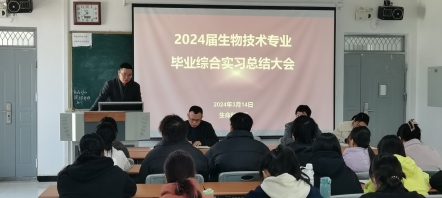 2024年3月14日上午,公司生命科学系成功举行了2024届生物技术专业毕业综合实习总结大会。365英国上市官方网站副书记何念武、辅导员张俊华、实习指导教师赵志新和2024届生物技术专业全体同学参加了本次会议,会议由生命科学系系主任华智锐主持。