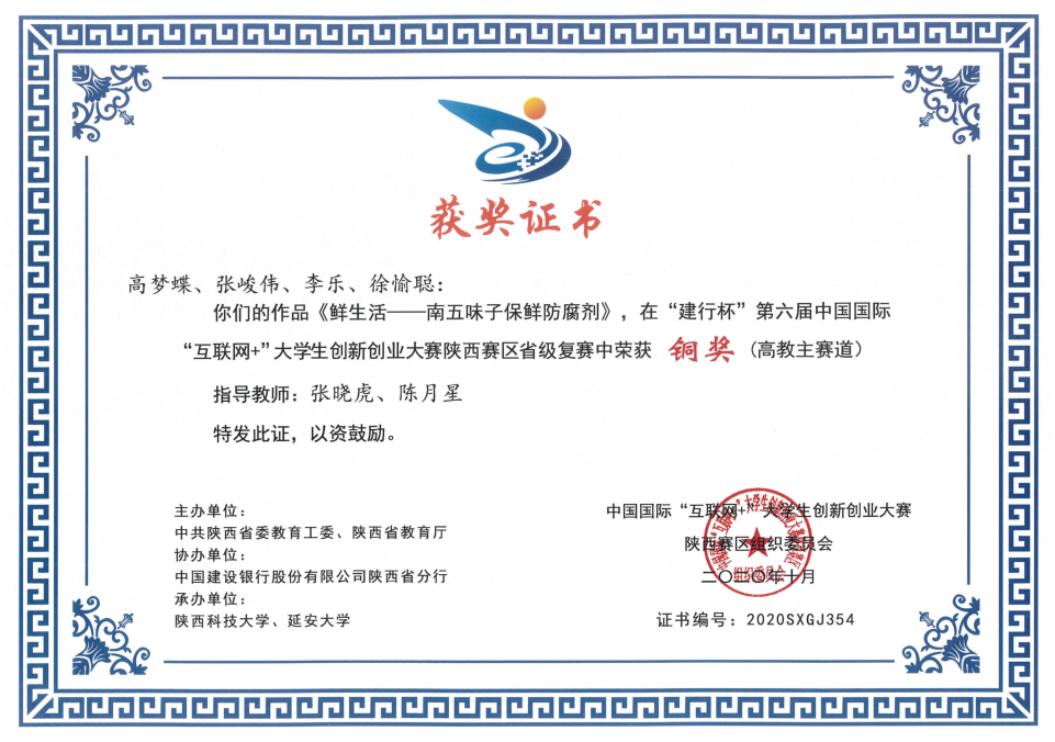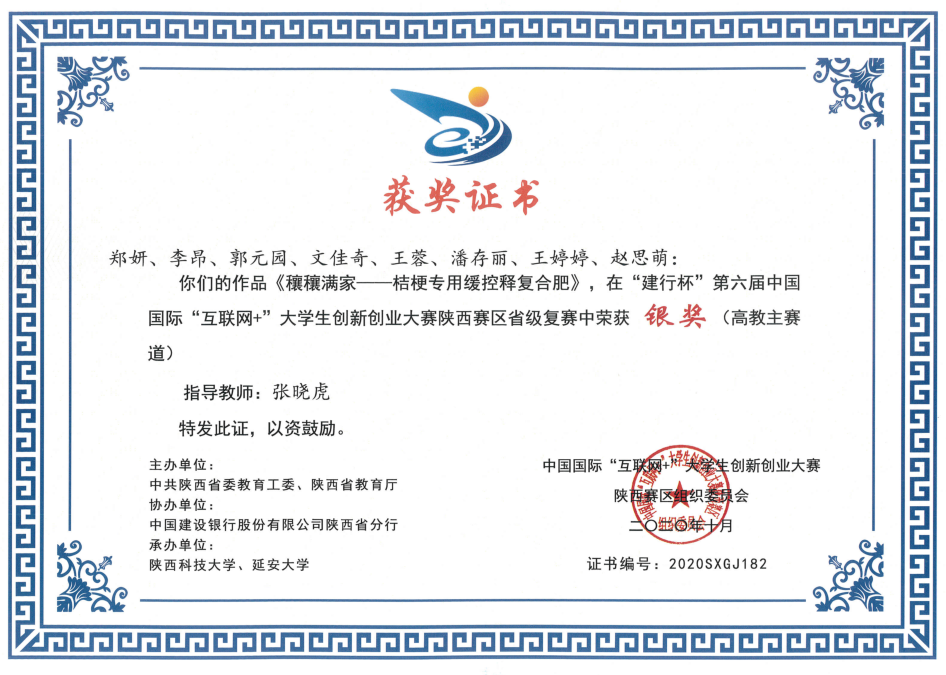 我支部教师张晓虎教授、陈月星博士共同指导员工完成的《穰穰满家—桔梗专用缓控释复合肥》《鲜生活—南五味子保鲜防腐剂》2个项目在获得公司第六届“互联网+”大赛校级金奖后,又分别获陕西省“互联网+”大赛银奖、铜奖。同时,支部教师邓寒霜、李筱玲分别指导员工获公司第六届“互联网+”大赛校级银奖、铜奖各1项。