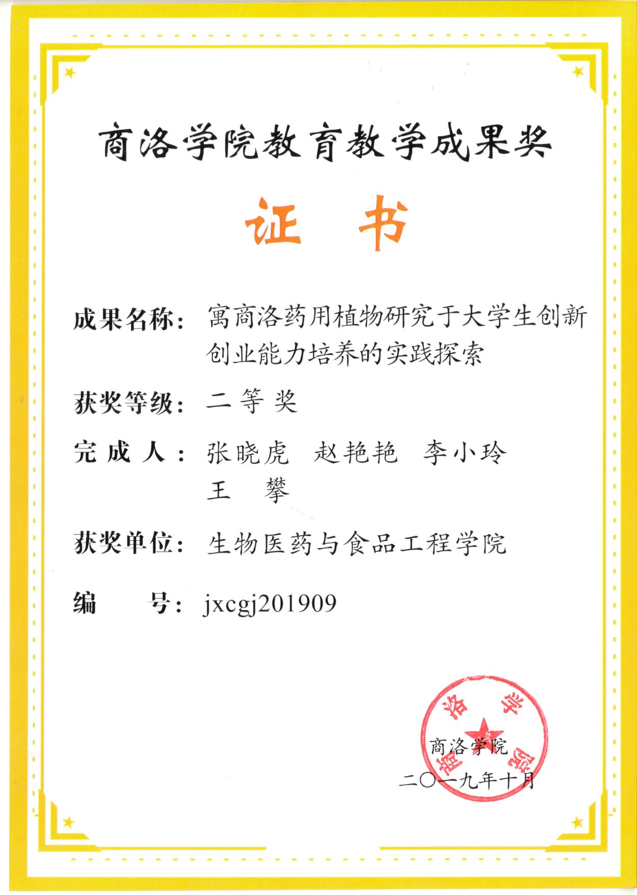 我支部张晓虎教授主持、赵艳艳博士参与的《寓商洛药用植物研究于老员工创新创业能力培养的实践探索》获校级教学成果二等奖。