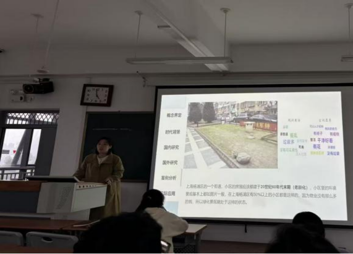 陈妍以《城市跟新下的老旧社区》为题,向同学们讲授了老旧社区的概念、时代背景及国内外研究现状和优秀案例,并结合自身从事景观设计和指导毕业设计的经历,从专业角度阐述了老旧社区改造的必要性和迫切性。