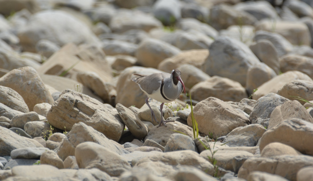 4月5日下午,调查团队沿山阳县金钱河徒步开展鸟类观测时,突然听到持续的清脆鸟鸣声,跟随声音仔细寻找后终于在一个由众多小石头构成的河心岛中发现了这只鹮嘴鹬。鹮嘴鹬的大红嘴看似醒目,但由于其体型较小仅40厘米左右,加之其身体颜色和岩石极为接近,因此阳光下隐身石滩中的鹮嘴鹬毫不醒目,远远望去如同一颗在石滩上滚动的石块一般,在长焦镜头的加持下才能一睹其芳容。