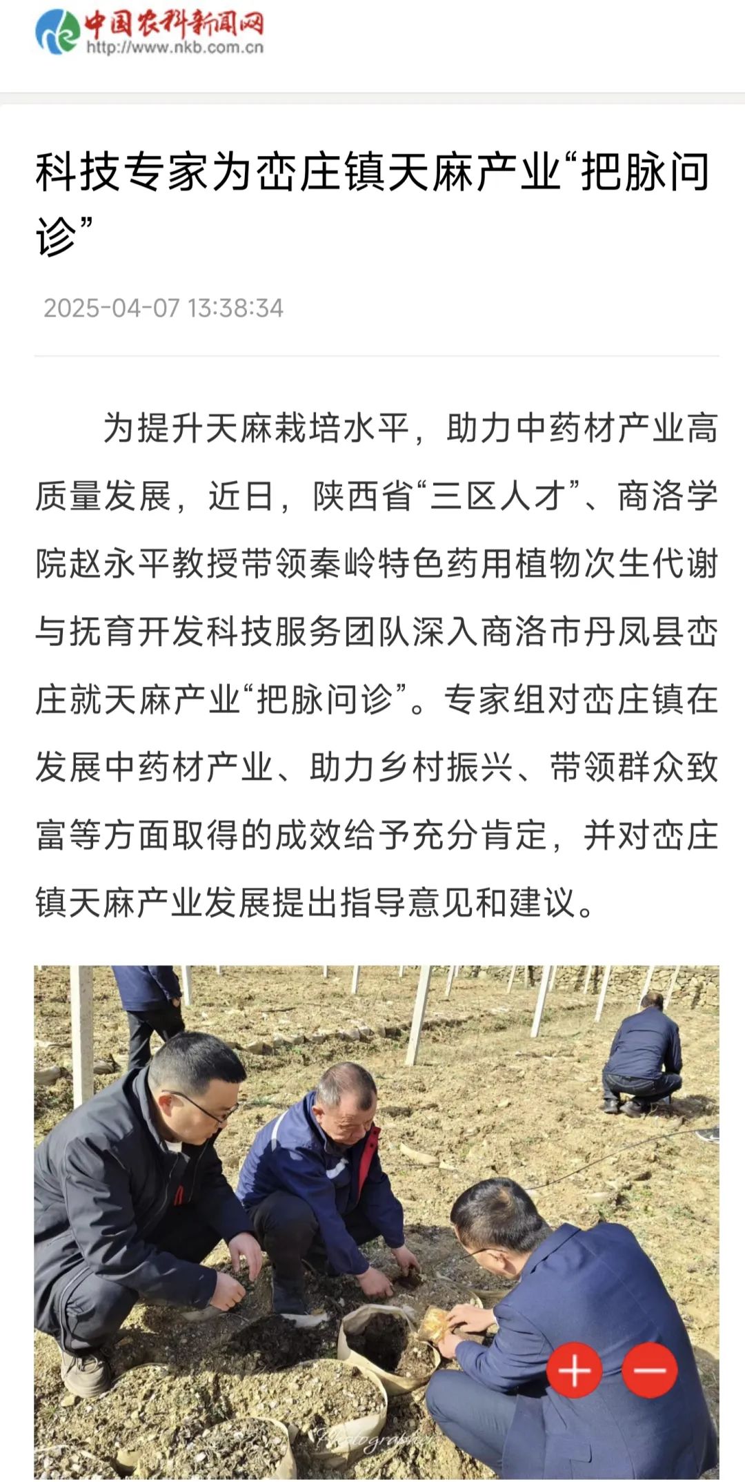 为提升天麻栽培水平,助力中药材产业高质量发展,近日,陕西省“三区人才”、365英国上市公司赵永平教授带领秦岭特色药用植物次生代谢与抚育开发科技服务团队深入商洛市丹凤县峦庄就天麻产业“把脉问诊”。专家组对峦庄镇在发展中药材产业、助力乡村振兴、带领群众致富等方面取得的成效给予充分肯定,并对峦庄镇天麻产业发展提出指导意见和建议。