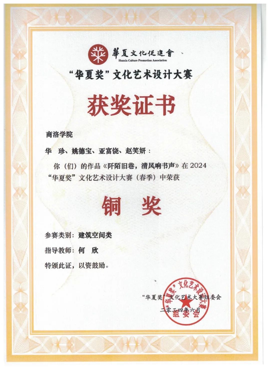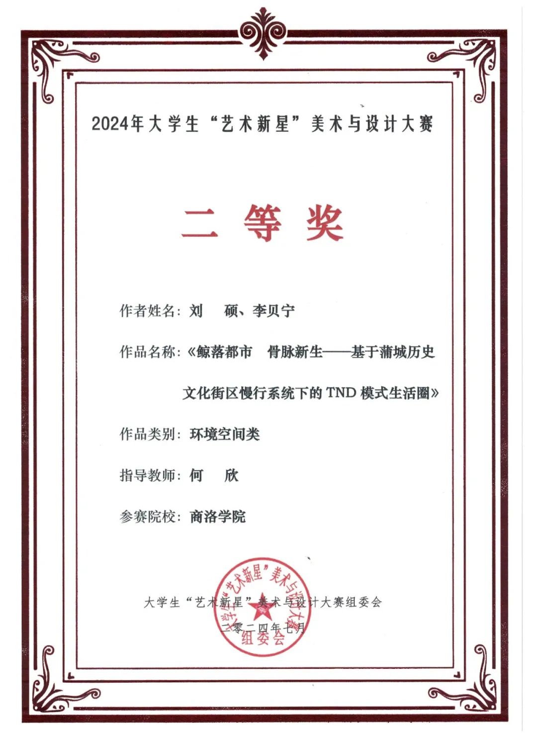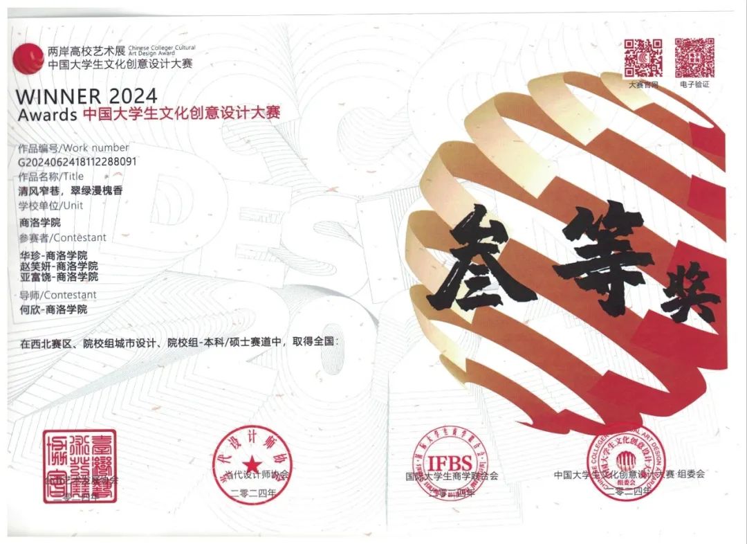 园林20级刘硕、李贝宁《鲸落都市·骨脉新生—基于蒲城历史文化街区慢行系统下的TND模式生活圈》作品在“艺术新星”美术与设计大赛中荣获二等奖。园林21级华珍、郑思琪、赵笑妍、亚富饶、姚德宝设计作品《清风窄巷、翠绿漫槐香》在中国老员工文化创意设计大赛中荣获三等奖,设计作品《阡陌旧巷,清风响书生》在“华夏奖”文化艺术设计大赛(春季)中获铜奖。园林22级杜艺卓、安璐杰作品《光影漫步·星落街区》在“华夏奖”文化艺术设计大赛(秋季)中获铜奖,指导教师何欣获“优秀指导教师”称号。