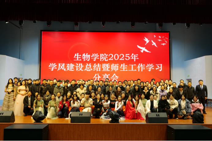 整场活动分为“师生联欢和“工作学习事迹分享”2个环节。师生联欢环节,师生纷纷上台表演,青春活力与艺术韵味交织绽放。郑天勤乐队以一支动感十足的乐曲率先登台,瞬间点燃现场气氛;张思涵等人的《健身排舞啦啦操》舞步整齐、热情洋溢,彰显着生物学子的青春风采;杨新颜等四人的《画中游》以曼妙舞姿勾勒诗意画面,原昊颖与于小哲的《红昭愿》以古典舞蹈展现雅致韵味,仝孟双等人的《卓玛》则以民族歌舞带来雪域风情。