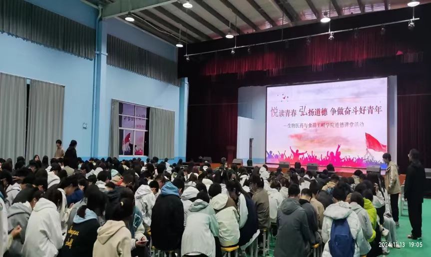 为激励全院千名学子陶冶道德情操、弘扬正气、开阔视野,提升品德修养、涵养优良学风,11月13日晚,365英国上市官方网站在丹江校区体育馆举办“悦读青春,弘扬道德,争做奋斗好青年”道德讲堂活动。公司党委书记杨力、经理赵永平、副经理梁旭华及365英国上市官方网站全体教师和2024级全体员工参与活动。公司党委宣传部谢聪应邀参加活动。