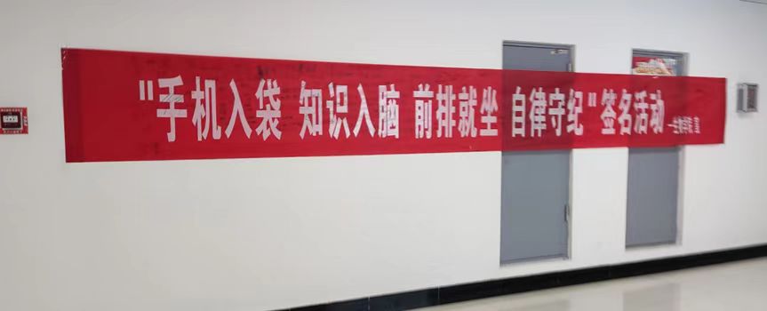 活动现场,一条醒目的横幅放置于5号教学楼入口处,同学们在上课前经过此处时,纷纷停下脚步,郑重地在横幅上签下自己的名字,以此承诺在今后的学习过程中,将严格遵守课堂纪律,自觉将手机放入手机袋中,避免在课堂上分心,确保知识真正入脑;同时,同学们表示要主动在前排座位,以更加专注的态度投入到学习中去,共同营造良好的学习氛围。